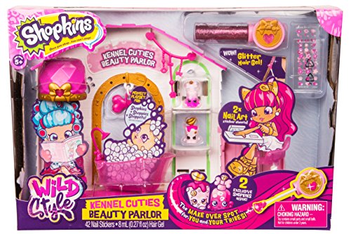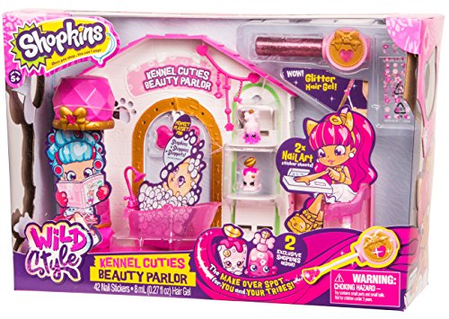 -. Binding : Toy -. Brand : Shopkins -. Color : White -. EAN : 0630996567050 -. Feature : Works with Shoppies, Shoppets and Shopkins / Includes Glitter Hair Gel and Nail Art Stickers for yourself / 2 Exclusive Glamour Gem Shopkins! / Salon chair and hair dryer adjusts to fit Shoppies, Shopkins and Shoppets / Includes a secret hide-away for your Glitter Hair Gel -. Label : Moose Toys -. Manufacturer : Moose Toys -. Model : 56705 -. MPN : 56705 -. NumberOfItems : 1 -. PackageQuantity : 1 -. PartNumber : 56705 -. ProductGroup : Toy -. ProductTypeName : TOYS_AND_GAMES -. Publisher : Moose Toys -. ReleaseDate : 2018-01-01 -. Size : 4.17'' x 11.81'' x 7.98'' -. Studio : Moose Toys -. Title : Shopkins Season 9 Wild Style - Kennel Cutie Beauty Parlor Playset -. UPC : 630996567050 -. Warranty : No Warranty