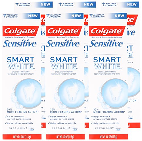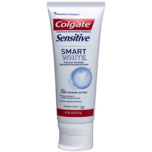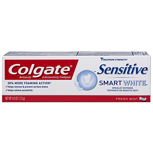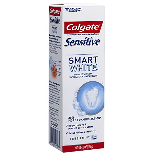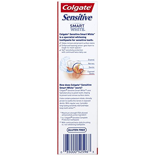 Colgate Sensitive Smart White Toothpaste is a specialist whitening toothpaste for sensitive teeth. Colgate Sensitive Smart White Toothpaste uses hydrated silica to polish teeth, helping to remove and prevent surface stains. It also contains potassium nitrate, clinically proven to soothe exposed nerves with continued twice-daily use. It has a fresh mint taste too. With regular use, it provides long-lasting sensitivity relief and helps keep teeth whiter (with continued twice daily brushing vs. non-whitening toothpaste).Feature