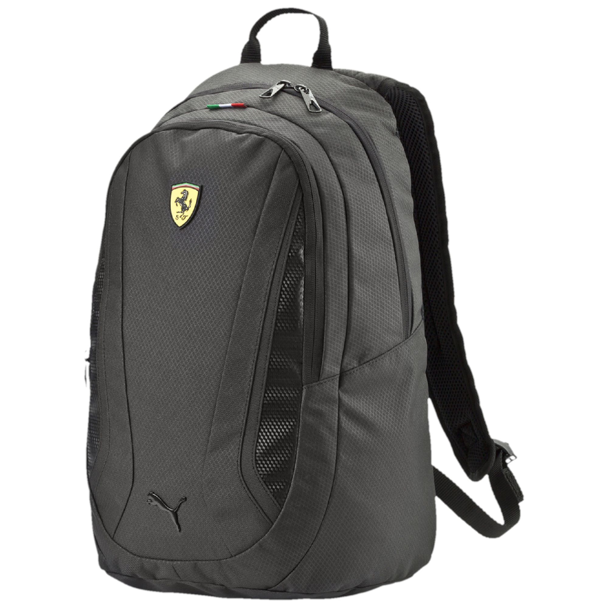 This marvellous Ferrari replica backpack from PUMA will be your daily load carrier for your motorsport lifedesign. * Two-way zip opening into main compartment. * Zip opening into front compartment. * Padded laptop compartment inside. * Padded and adjustable shoulder straps. * Webbing carrying handle for extra convenience. * Exclusive Ferrari branding. |