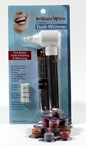 This kit is also a perfect use in between visits to your dentist to gently and effectively remove tough/ugly surface stains from smoking, coffee, tea, wine and food that normal brushing doesn't remove. It also leaves your teeth with that nice, glossy smooth feeling you get after a professional tooth polishing. Includes Battery Operated Electric Tooth Polisher 14 cups of coarse grit professional strength polishing paste 5 Long Lasting Polishing Cups 2 AA Batteries Included DIRECTIONS: First place a small amount of the tooth polish in rubber cup. When ready to polish hold the dental polisher upright in your hand with your forefinger near the On switch and a free finger on your chin for easier control of polishing Before turning the switch on. Use the rubber tip to spread a little of the tooth polish over the teeth you will be polishing. Then with the rubber tip just making contact with the tooth surface activate the power by pressing the switch and proceed to polish the teeth. Do not use pressure. The gentle rotating cup will give your teeth that polished brightness and gleaming smile. To install batteries to dental polisher, simply unscrew the handle from polisher head then drop the batteries into the base making sure that the positive (+) end of the batteries are facing up. Screw base and top securely together. Never immerse in water. After every use remove the cup and clean with water. wipe outside with a soft cloth or tissue. Not recommended for use by children 12 years old or younger. Caution handle may get hot if used for an extended period of time. Description of Tooth Polish: The polish is manufactured by Dharma Research, here in the US. The are the manufacturers of the entire Lapiss line of whitening products. It is coarse grit with fluoride for maximum effectiveness. A mixed assortment of flavors will be shipped at random (guaranteed to receive all flavors)Feature