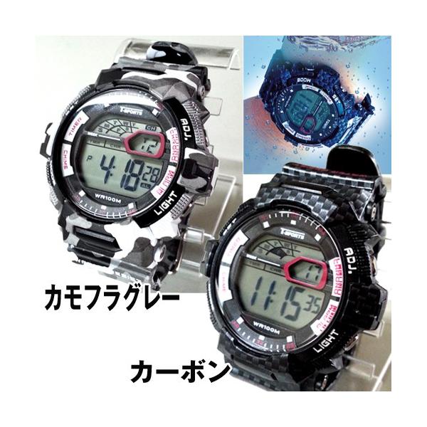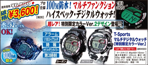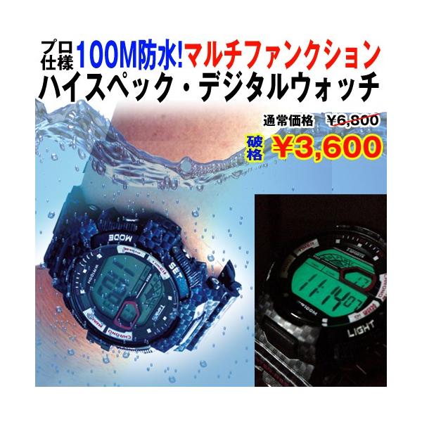 プロ仕樣!100M防水!!マルチファンクションで「時」を手中にする!通常7,344円(税込)の処、47%OFF!特別価格3,888円(税込)にて限定販売!SUPER100M防水・・・水に浸かってもOK! 機能満載ハイスペック・デジタルウォッチ! 超レア!特別限定カラーVer. 【機能】 ★100M防水 潜水や水泳や水仕事など長時間水にふれても全く問題なし ★1/100ストップウォッチ 経過時間の計測ができます。 ★ELライト 暗い場所でも時刻を確認できます。 ★時報 1時間ごとに音でお知らせ。 ★アラーム 設定した時刻に音を鳴らします。 ★カウントダウンタイマー 最大5分のカウントアップ! 30秒ごとのチャイムと終了時にピープ音を鳴らします。 ★日付・曜日カレンダー 月・日・曜日を表示。 ★12/24時間表示切替え 時間表示を、24時間表示にも切替えられます。 ★第2時刻 デュアルタイム表示機能