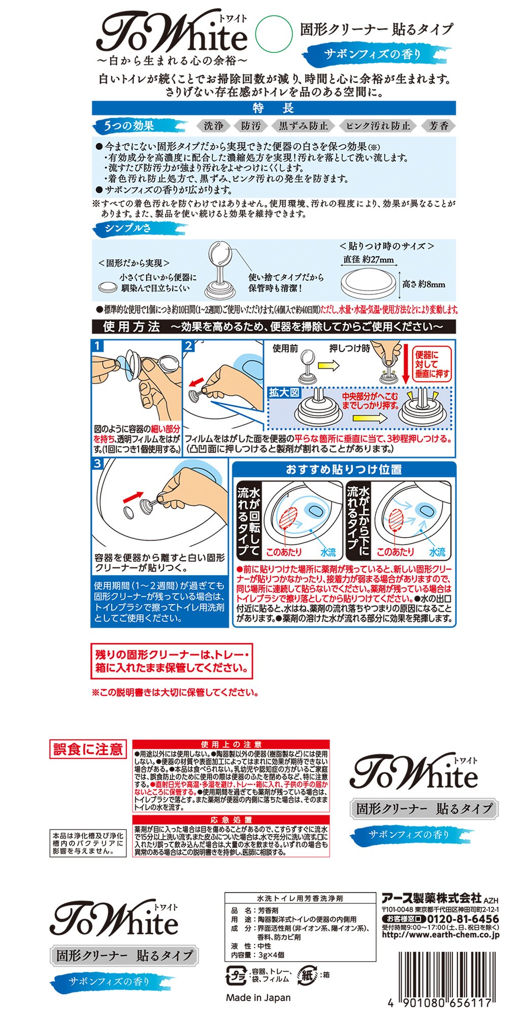 · Effect of keeping the whiteness of urinal which could be realized because it is a solid type which has not existed so far (It does not prevent all coloring dirt.The effect may vary depending on the use environment, degree of dirt.In addition, keep using the product