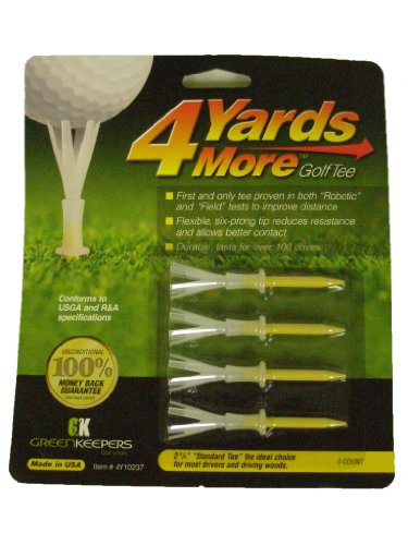 The Greenkeepers 4 Yards More Golf Tee is the first and only tee proven in both robotic and field testing to improve distance. The dynamic, 6-prong crown flexes with the force of your drive to reduce resistance at impact and to allow for better contact. The ball launches off the tee with less friction and lower ball spin, resulting in longer, straighter drives. The durable, multi-material construction lasts for over 100 drives. Available in 1-3/4", 2-3/4", 3-1/4", 4", 4 pc. Variety Pack and 1" Hybrid Pack of 6.Feature