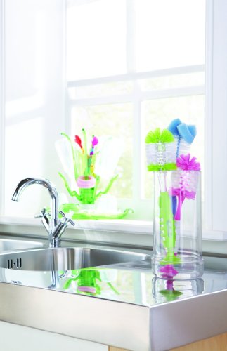 The Munchkin Soap Dispensing Bottle Brush is a brightly coloured bottle brush with suction base that dispenses soap at the touch of a button, its durable bristles reach hard to clean areas, ideal for standard, wide neck or angled bottles. The brush is top rack dishwasher safe and comes in assorted colours.