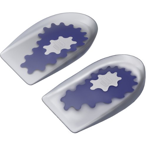 -. Feature : Non-compressible, viscoelastic silicone heel cushions have softer blue "spot" correctly placed for additional cushioning where heel pain originates. High quality, medical grade silicone helps provide superior comfort and long-lasting effectiveness. Slight medial posting helps redirect pressure away from the painful area. / 1/2-inch lift takes tension off the plantar fascia to relieve pain. Superior shock absorbing qualities reduce shock to the joints and vertebral column. Does not absorb odors or exude oil. / Easy to clean with soap and warm water. Available in pairs to prevent leg length discrepancies. Can be switched from one pair of shoes to another. / Does not contain latex. Does not absorb odors. 6 1/2 for Men 8 for Women. / 7+ for Men/2+ for Women.