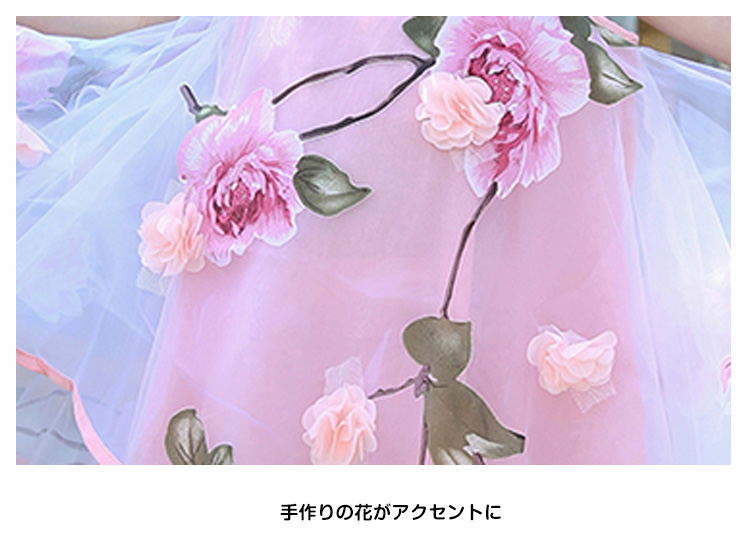 | 豪華な花モチーフワンピース手に取った瞬間から花の妖精に変身!たっぷりと生地を取った贅沢な一枚は美しいフレアラインを生み出し、ボリュームのシルエットがcute!鮮やかな花飾りがワンピースを彩り、華やかさをアップ身頃を拾わないフレアシルエットも嬉しいポイントパーティーや結婚式などフォーマルシーンには絶対大活躍してくれそう | |