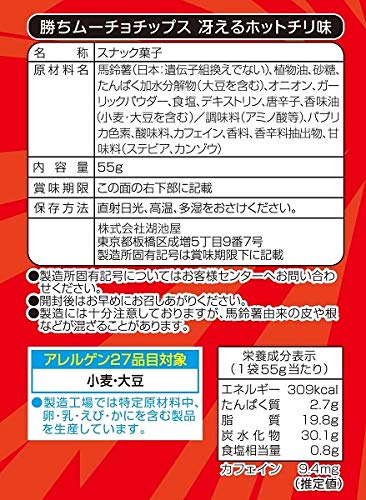 原材料:馬鈴薯(日本:遺伝子組換えでない)、植物油、砂糖、たんぱく加水分解物(大豆を含む)、オニオン、ガーリックパウダー、食塩、デキストリン、唐辛子、香味油(小麦・大豆を含む)/調味料(アミノ酸等)、パプリカ色素、酸味料、カフェイン、香料、香辛料抽出物、甘味料(ステビア、カンゾウ)