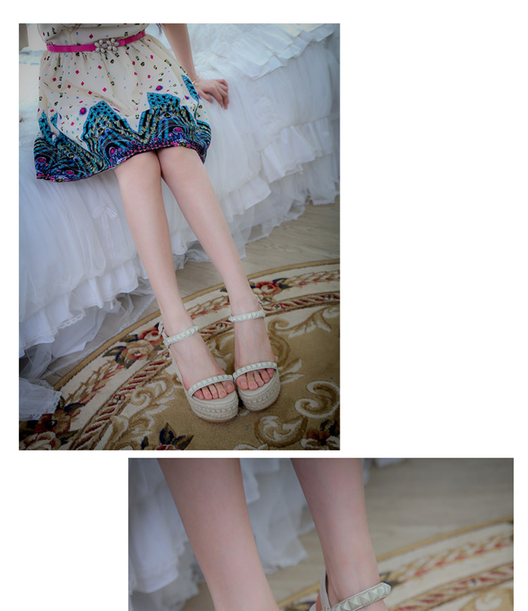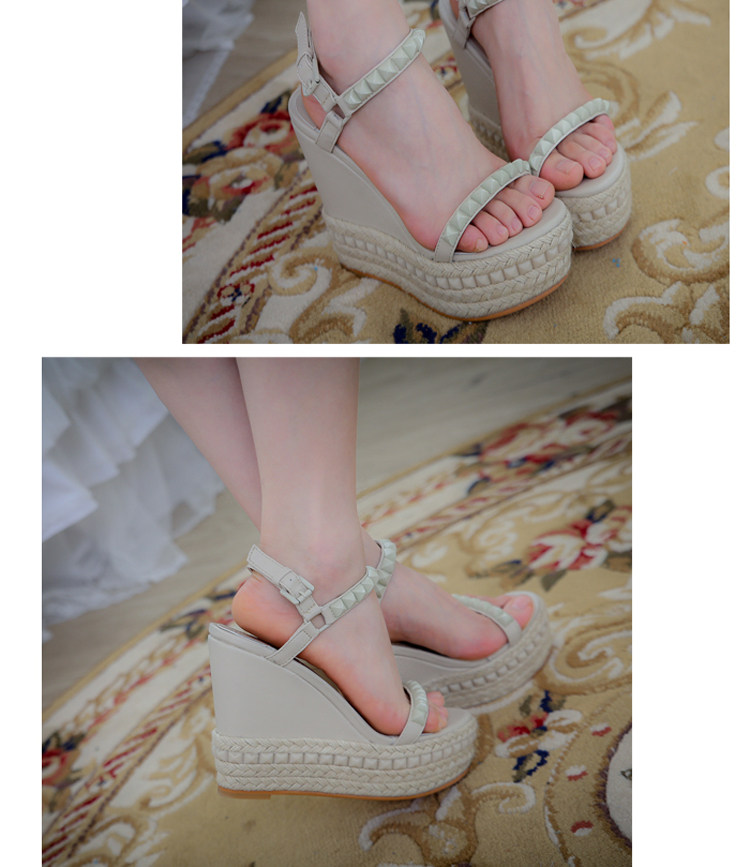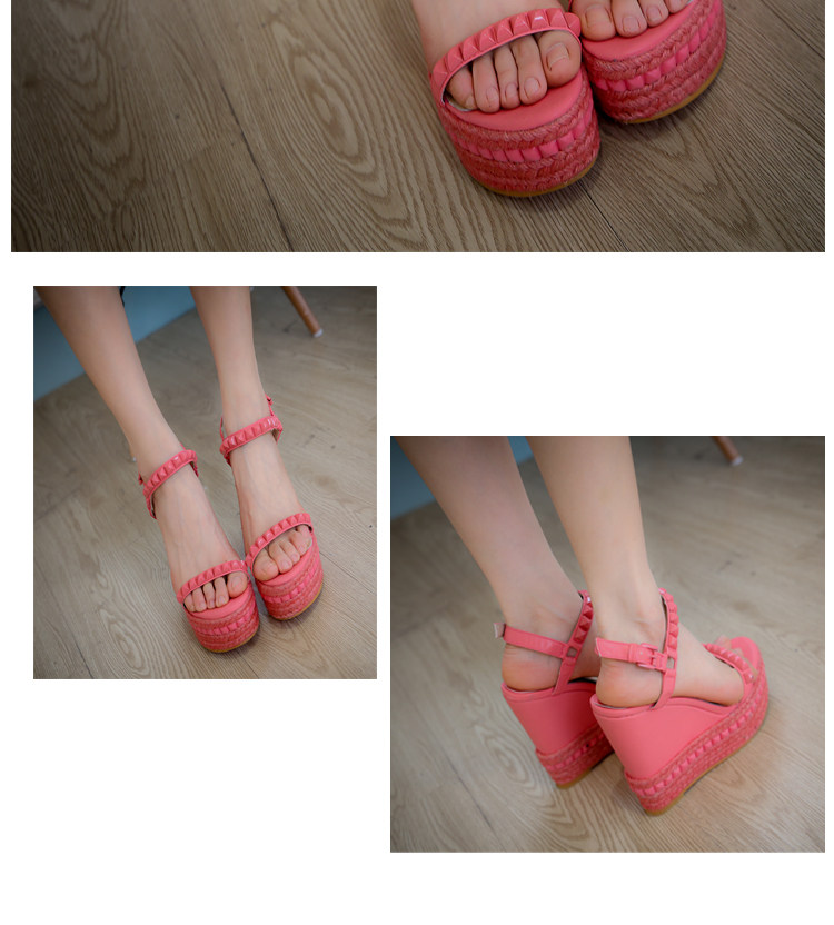 夏款新款红底草编麻绳编织铆钉厚底松糕鞋坡跟高跟防水台凉鞋