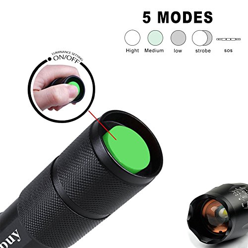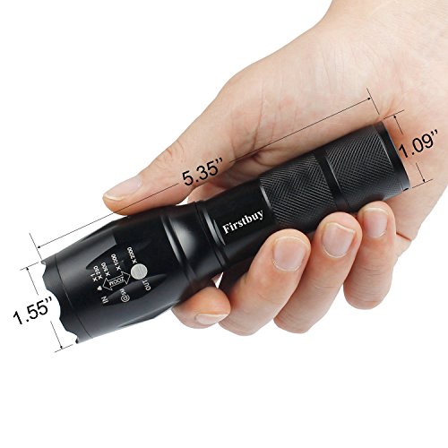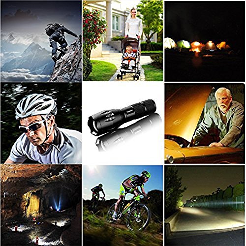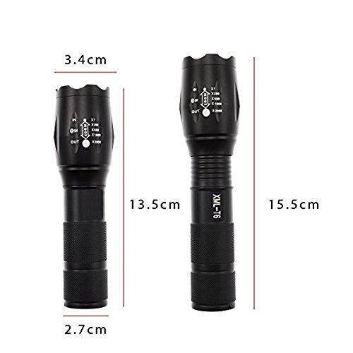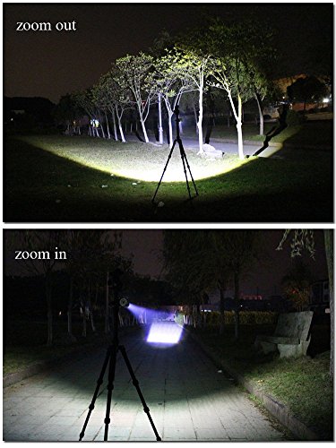 -. Feature : Super Bright Flashlight: Cree XML-T6 LED Bulb, Adjustable focus, Zoom out 500-700 Lumen,Zoom in 700-900 Lumen. / 5 Switch Modes: high / medium / low / strobe / SOS; With ON OFF button, easy to operate / Power Source: 1 x 3.7V 18650 Battery(Included)or 3x AAA battery (Not Included) / Skid-proof and water resistant design, makes it perfect for outdoor activities, such as outdoor camping,hiking, climbing, cycling, etc / Durable Aluminum Alloy Material: aircraft grade alloy, premium type 3 hard-anodized, anti-abrasive coating. Toughened, ultra clear glass lens, with anti-reflective coating.