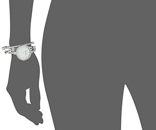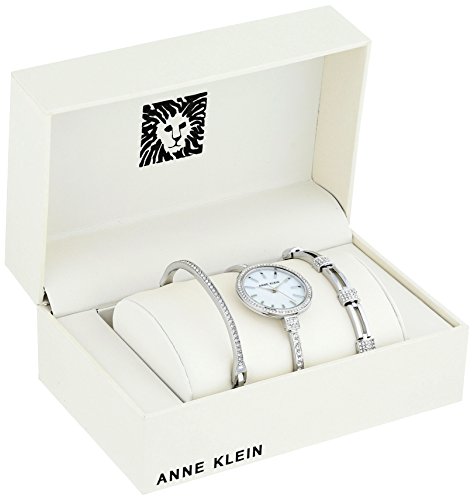 Bezel and lugs set with 80 Swarovski crystals; mother-of-pearl dial with silver-tone hands and markers; silver-tone bangle with 32 Swarovski crystals; adjustable end links; jewelry clasp and extender