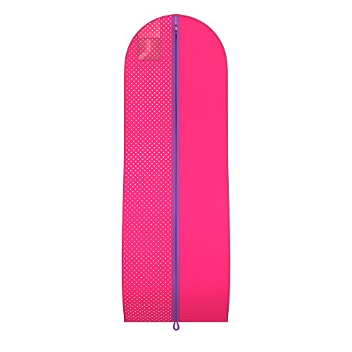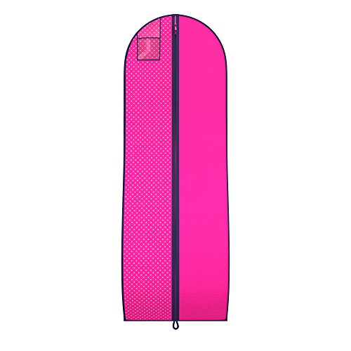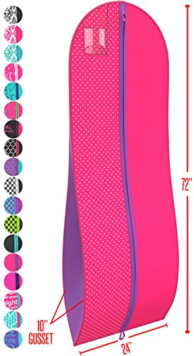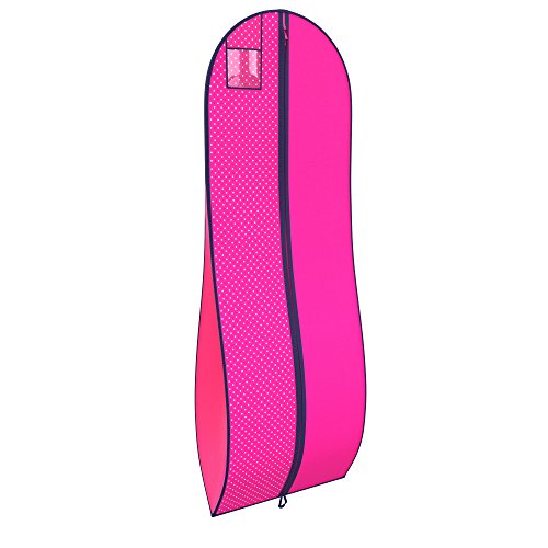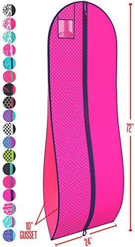 Product Description Keep your cherished gowns and dresses protected in this premium quality garment bag from Your Bags. This garment bag makes preparing for formal affairs less stressful. Pick from a variety of colors in a fun and pretty polka dot style and prepare to turn heads! You'll feel at ease knowing that your beautiful dress is shielded from damage and destruction. FEATURES: ? Non-Woven 80 GSM ? 72 x 24" ? 10" Tapered Gusset ? Dual Zipper Slider ? Bottom Hanging Loop ? Hanging ID Pocket POLKA DOT COLORS: ? Fuchsia Purple ? Black Tiffany Blue ? Fuchsia Navy While most garment bags are made from a 60 GSM ours are constructed from a super durable non-woven 80 GSM that makes our bags stronger and more protective. Measuring at 72 x 24 inches with a 10 inch tapered gusset it provides enough space for ball gowns and dresses with full skirts without causing any damage. A bottom loop that fastens to your hanger to join both ends makes it easy to carry and store without dragging on the ground. While dual slide zippers allow you to quickly access its contents from both ends. A large visible hanging ID pocket makes it easy to identify your bag and whatever you keep stored inside of it. MULTI-PURPOSE This bag doesn't just hold dresses either it also easily functions as a garment bag for men's suits and clothing. A roomy interior means you can fit virtually any type of clothing in this bag you can smartly transport and store multiple small clothing items. Store apparel in this bag and keep it protected from moth damage and dust for many years! 0