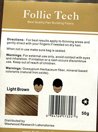 -. Binding : Misc. -. Brand : Follic Tech -. Color : light Brown -. EAN : 0804482381035 -. Feature : Hair Building Fibers Hair Loss Concealer With A 30 Money Back Guarantee / Highest Grade Refill That You Can Use for Your Bottles from Competitors Like Toppik®, Xfusion®, Miracle Hair® / Instantly fills in balding & thinning areas for a full look. / Made In The USA not China like most of the refills on Amazon / Call (732) 207-6580 with any questions -. IsAdultProduct : 0 -. Label : Westwood Research Laboratories -. Manufacturer : Westwood Research Laboratories -. MPN : 804482381035 -. PartNumber : 804482381035 -. ProductGroup : Beauty -. ProductTypeName : BEAUTY -. Publisher : Westwood Research Laboratories -. Studio : Westwood Research Laboratories -. Title : Light Brown Keratin Hair Building Fibers 57 grams Refill Your Existing Bottle, Made In The USA -. UPC : 804482381035