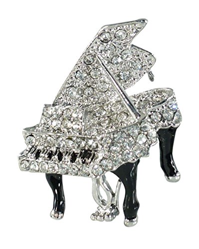 The perfect gift for the music lover in your life. Looks great on a sweater, coat or jacket. Silvertone with genuine rhinestones and enamel. About 1 1/2 inches long overall and 1 1/4 inches wide. Pin back with safety C clasp. Not for children age 12 and under. Made in China.Feature