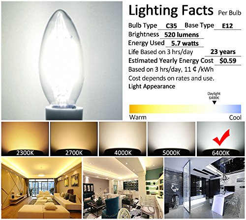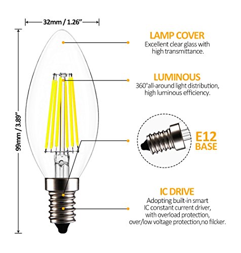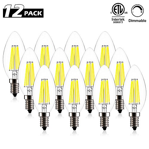 CREATE BRIGHT C35 Edison Blunt Tip Filament Candelabra LED Bulb,6W(60W Incandescent Equivalent),Dimmable LED Candle Bulbs,E12 Base Lamp,520lm,6400K Daylight,360°Beam Angle,ETL Listed,Pack of 12