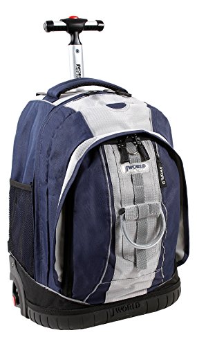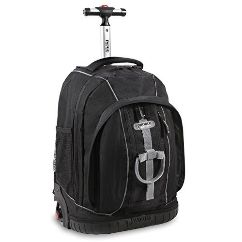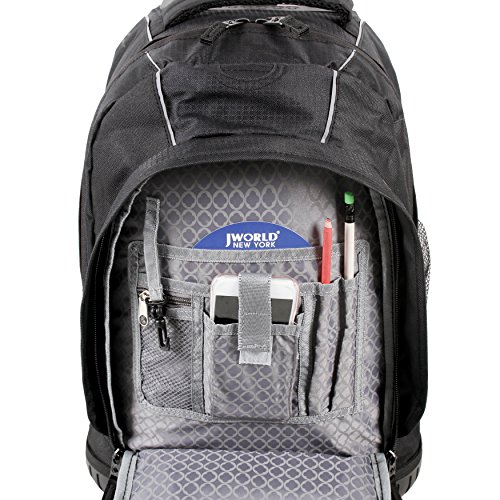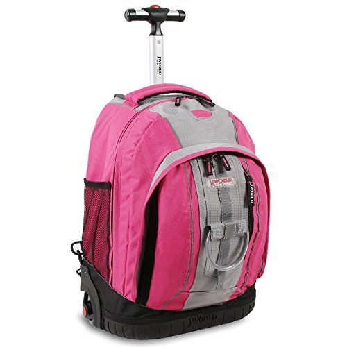 J World New York twinkle light up wheel rolling backpack features a main compartment, a telescoping single handle, a front pocket with organizer, padded shoulder straps and back with slip-in system, side mesh pockets, and light up wheels.