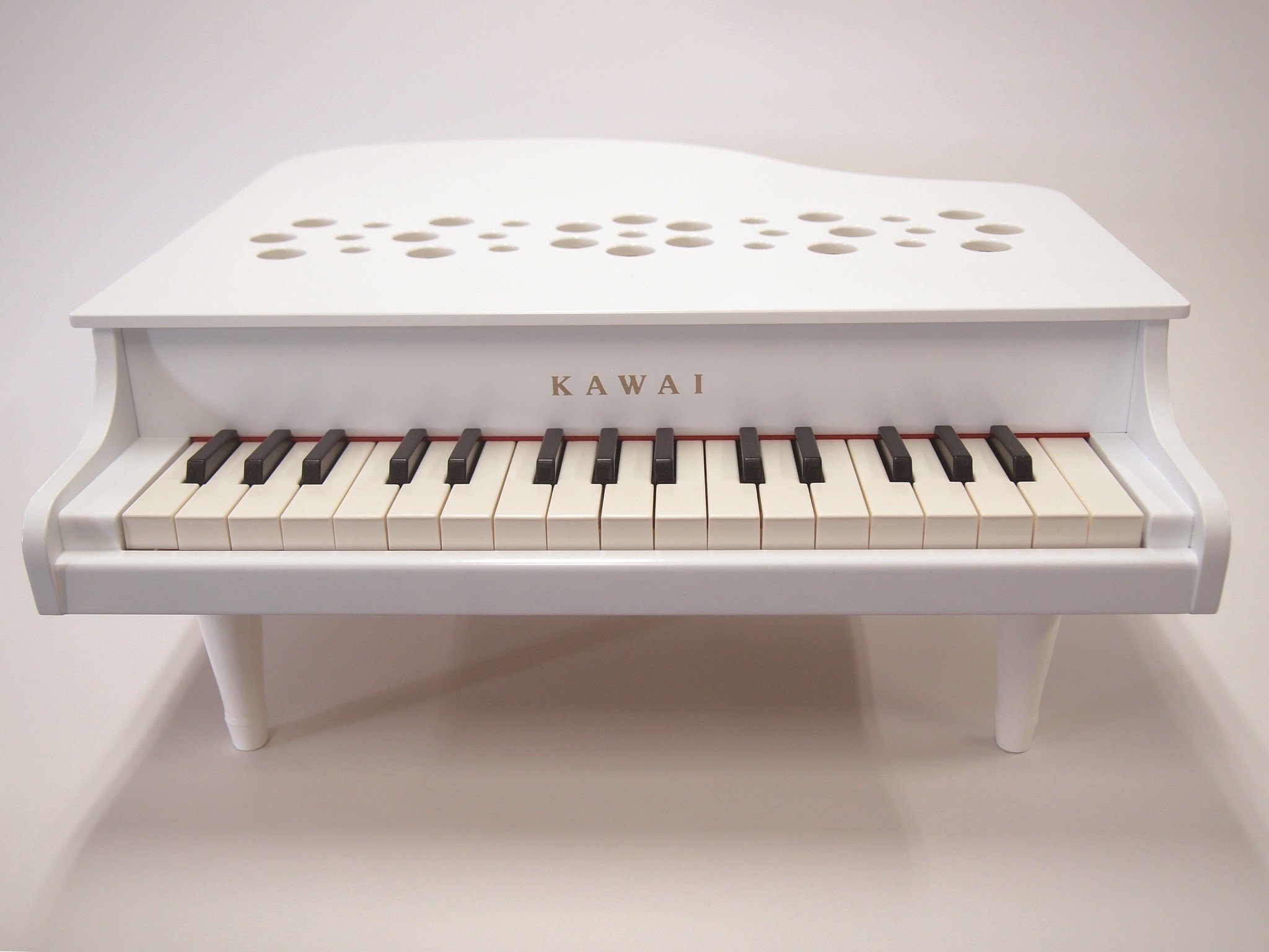 It is a 32-key grand piano-shaped toy piano with no roof open.