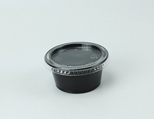 Disposable 2oz Black Plastic Condiment Cups with Lids 100-Pack, Sample Cup, Jello Shot Cups, Salad Dressing, Souffle Portion, Sampling EASYWARE