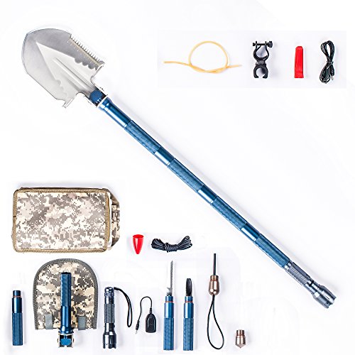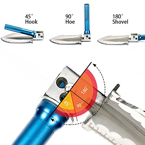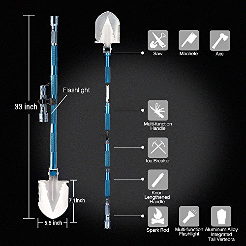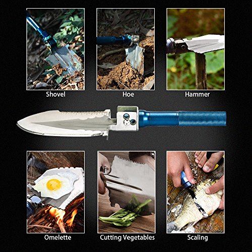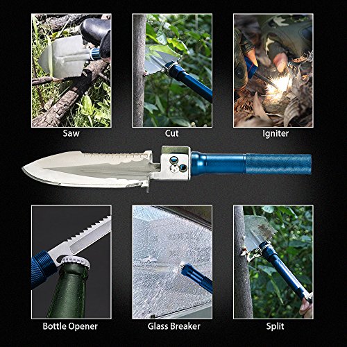 ALL IN ONE MULTIFUNCTION: It could be used as Rescue Knife, Hoe, Shovel, Ice-axe, Hammer, Bottle Opener, Bow, Nail Puller, Hexagon Spanner, Fire Stick, Saw etc. It is designed for: Exploring, Camping, Traveling, Hiking, Garden Use, Driving Emergent Tools For daily outdoor use, this entrenching shovel can also be used as garden shovel, snow shovel, and trench shovel.