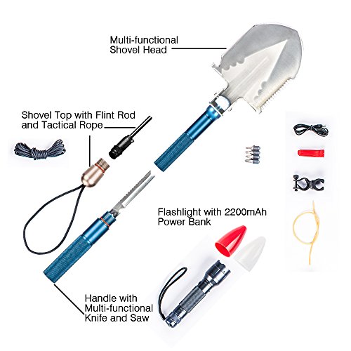 COMPACT & PORTABLE: Package size: 7.1 x 5.5 x 3.3 inches, Gross weight: 5.3 lbs., Package includes: Multi-function Shovel head x 1, Multi-function Flashlight x 1, Multi-function Screwdriver x 3, Multi-function handle x 3, Emergency Charge Converter x 1, Multi-function Rescue knife x 1, USB Charging Cable x 1, Lifesaving Rope x 1, Whistle x1, Hemostatic Hose x 1, Light filters x 2, Pouch x 1 Nail puller x 1, Fire stick x1, all tools of this folding shovel comes in a carrying pouch at your side.