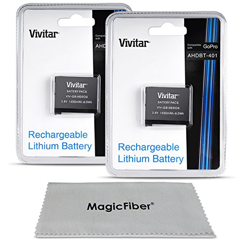 (2 Pack) Vivitar AHDBT-401 Battery and Dual Charger for GoPro HERO4 (GoPro AHDBT-401 and AHBBP-401 Replacement) - Includes: 2 Rechargeable 1650 mAh Batteries + Dual Charger + Cleaning Kit + MagicFiber Microfiber Lens Cleaning Cloth