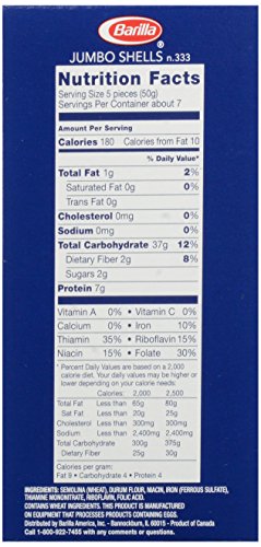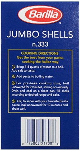 -. Feature : Large shape that is inspired by sea shells, perfect for filling / Cooks in 12 minutes / Can be filled with your favorite pasta stuffing, including cheese or tomato-based sauces / Good source of thiamin, folic acid, iron, riboflavin and niacin / Product of USA, Kosher certified