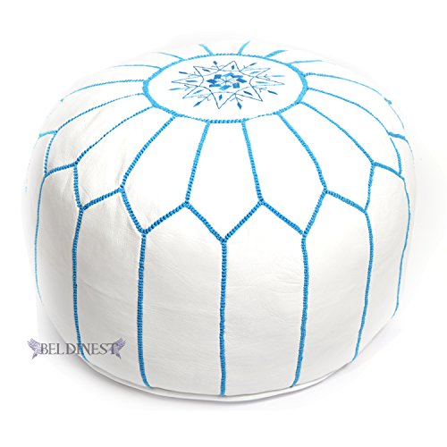 Studio : BeldiNest Publisher : BeldiNest Product Description Moroccan Poufs are wonderful leather ottomans used for seating. This type of furniture can go by many names, such as hassock, tuffet , and of course ottoman. Outside the USA it's more commonly spelled "Pouffe". These lovely round ottomans have many different uses. For example it's an excellent foot stool or foot rest and a lovely piece of furniture or housewares; however it's mainly used for seating. A Moroccan Pouffe makes for an excellent piece of home decor. We hand process our Moroccan poufs by the same traditions that remain unchanged for centuries and were passed down through families for generations. We use an earth-friendly process to produce these poufs this includes using natural dyes and sunlight to tan the hides. We embroider colorful hand stitched designs onto the leather pouffe. We create new ideas to design new styles that bring trend to the world of home decor and design. A Moroccan Pouf can come in a large variety of colors sizes and styles from simple plain designs to intricate and embroidered designs. As much as these leather poufs are useful, this type of furniture can bring a nice addition and provide seating to any room whether inside homes, restaurants, hotels, clubs, and much more, it's a beautiful piece of home decor. This hand stitched white leather pouf with Turquoise silk embroidery will make that additional impact. Colors: White/Turquoise Finish: Hand-stitched Upholstery materials: Goat Leather Upholstery color: White Leather Pouf/Turquoise Dimensions: 14 inches high x 20 inches in diameter All our Moroccan poufs are sold stuffed. 0