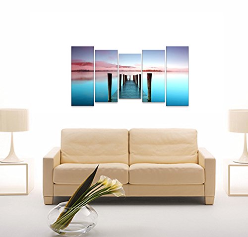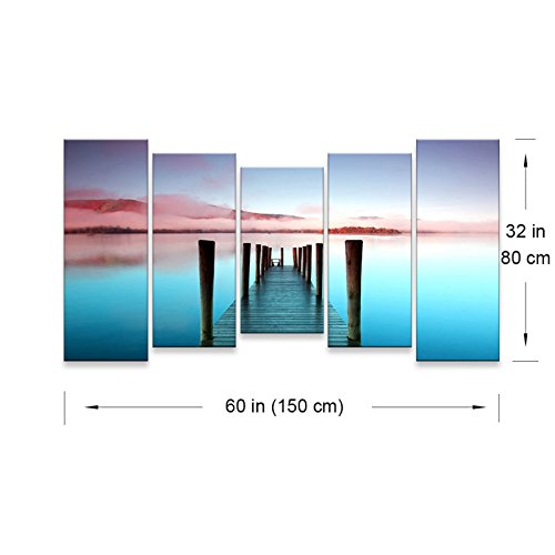 1: Beautiful lake pier canvas wall art printed and framed by SZ HD Painting. The artist-grade canvas has strong sense of texture and full of artistic touch, reflects your noble temperament and taste. This canvas picture dimensions: 32"x60" overall by 5 piece = 80x150cm overall by 5 panels.