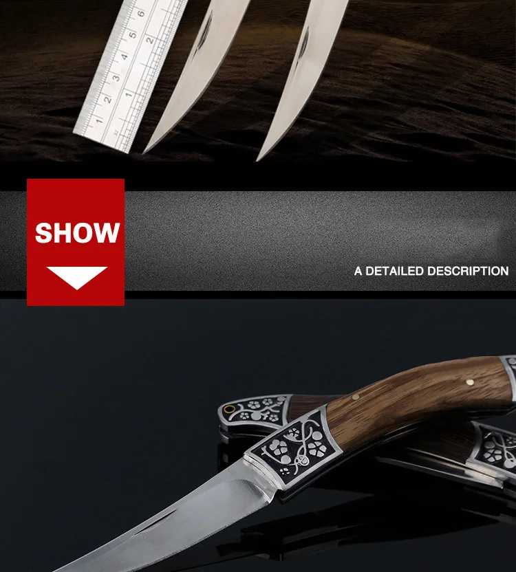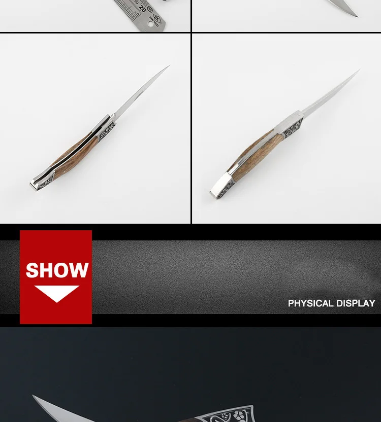 상품명: 619F 전체 길이: 21 센치메터 블레이드 길이: 9.5 센치메터 핸들 길이: 12.CM 블레이드 폭: 2 센치메터 두께: 2.4 미리메터 블레이드: 7CR17MOV 핸들: 얼룩말 나무 경도: 상당 56HRC 표면 처리: 거울 빛 칼 세트: 나일론 세트 무게 (포장): 130 그램