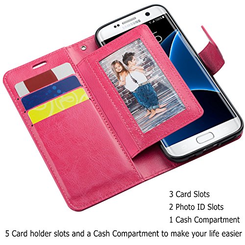 SUPTECH Galaxy S7 Edge Case [Stand View][Detachable Wrist Strap] Samsung S7 Edge Wallet Case with 5 Card Holders Flip Cover for Samsung S7 Edge (Rose Red)