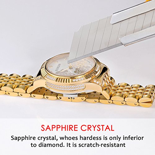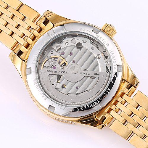 -. Feature : The Japan Imported Automatic Movement, 21 Jewel, Miyota Brand.Mechanical watches for women. / Synthetic sapphire face, scratch resistant and wear-resisting display.18K gold plated luxury watches for women. / Water resistant to 50 meters underwater, you can wear it when you swimming and our watch will be work as well. / The Rose Pattern Dial, Rose Shape Second Hand Design, With a day calendar. A great watches which make you like a Queen! / Specification-case thickness: 0.43in (11mm), case diameter:1.33in (34mm), band width: 0.63in (16mm).Attention: if you got a big hand, you'd better measure the wrist diameter to see the band would match before making the order. If it didn't, then you can leave the message, we can make it extra-long fit your size