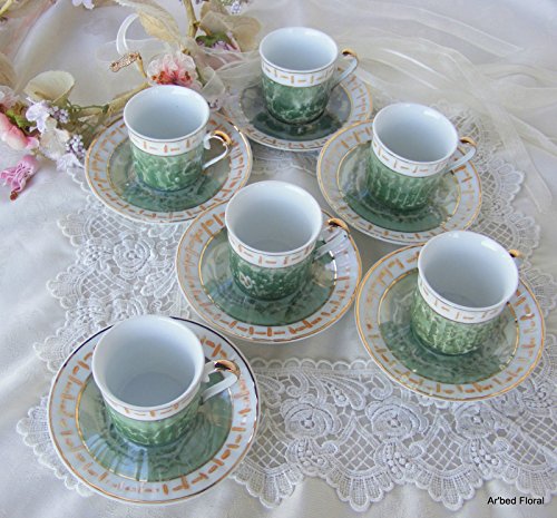 -. Title : Childrens Set of 6 Tea Cups and Saucers ~ Green Porcelain
