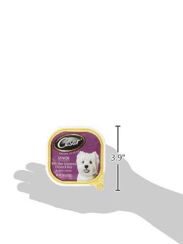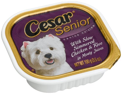 Contains (24) 3.5-oz. trays of CESAR Canine Cuisine Senior With Slow Simmered Chicken and Rice Senior Dog Food. CESAR Canine Cuisine Trays feature delectable chicken and rice flavor pate in meaty juices formulated for senior dogs with refined tastes