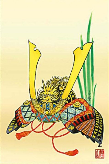 男の子の誕生と健やかな成長を祝い、将来の出世と無病息災を願う端午の節句の掛け軸です。兜という静物の中に秘められた勇壮な気概を表現した逸品です。 |