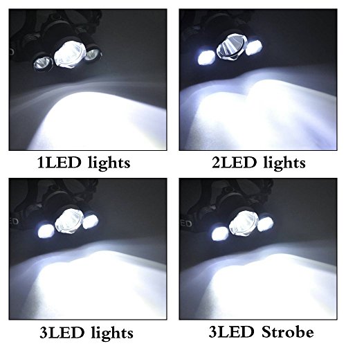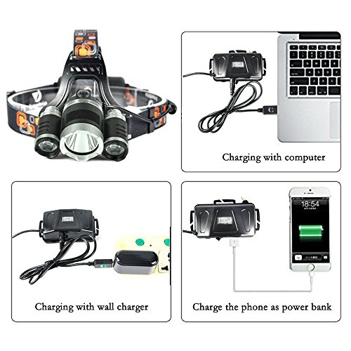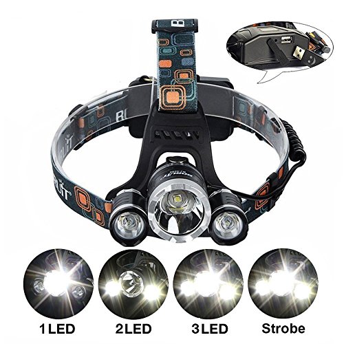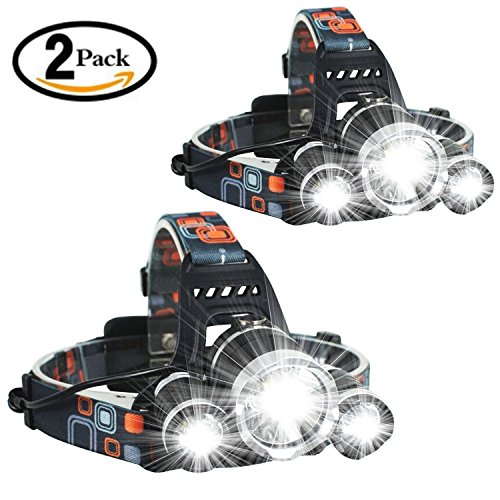 2 Pack Brightest and Best High Powered Lumen Bright Headlight Headlamp Flashlight Torch 3 XM-L2 T6 LED with Rechargeable Batteries and Wall Charger for Hiking Camping Riding Fishing Hunting