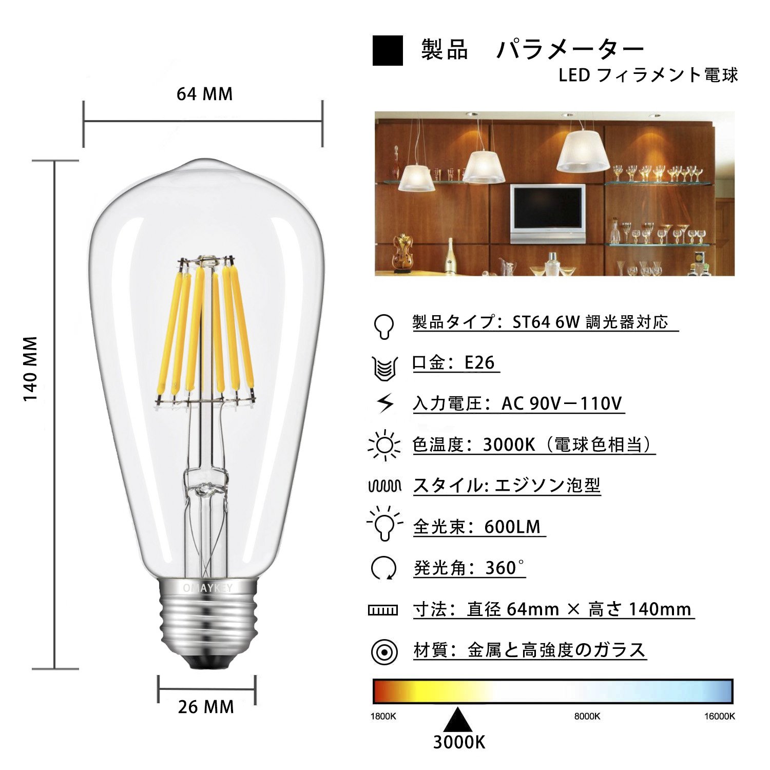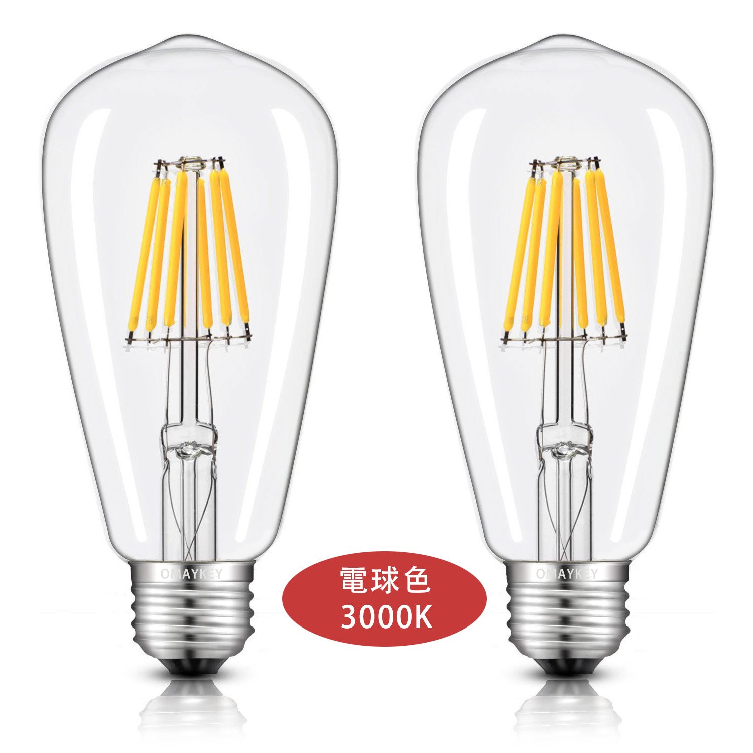 OMAYKEY LED light bulb filament dimmer compatible 6W (incandescent bulb 60W type) bulb color E26 ST64 retro edison valve clear glass general bulb omni-directional type 2 pieces