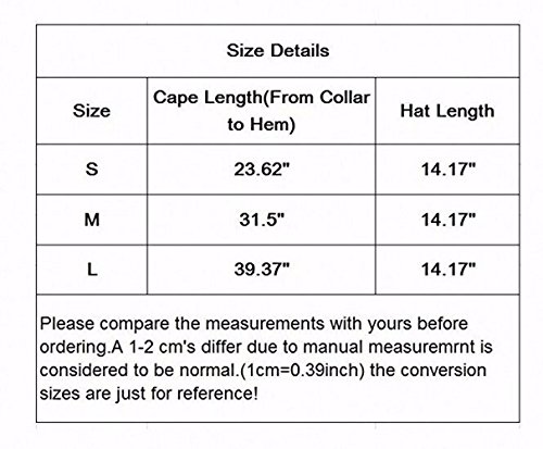 Size:S/23"(60cm),M/31"(80cm),L/39"(100cm) from shoulder to hem,cap height:14.1"(36cm);Quantity:1 x cape;Weight:Approx 180-200 grams
