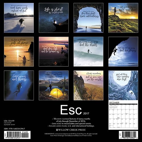 -. Feature : 2017 The Esc Escape Wall Calendar / The Esc wall calendar illuminates the lure of adventures that await those willing to press their own escape button and veer off the beaten path. / Photographs of spectacular landscapes are paired with quotes from great adventurer's past and present. / 18 Month Calendar