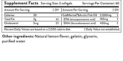 -. Feature : POTENT - 2,000 mg omega-3 fish oil per serving (160 mg EPA and 400 mg DHA) in triglyceride (TG) form. / SUSTAINABLE - Certified by the Marine Stewardship Council. / PURE - Fish oil is sourced from wild deepwater fish off the coast of Norway. / QUALITY - Made in an NSF cGMP certified facility. Molecularly distilled for purity and potency. No sugar, gluten, dairy, or artificial additives. Third party quality tested. / BENEFICIAL - DHA can support cardiovascular and cognitive health and support brain and eye development in children.