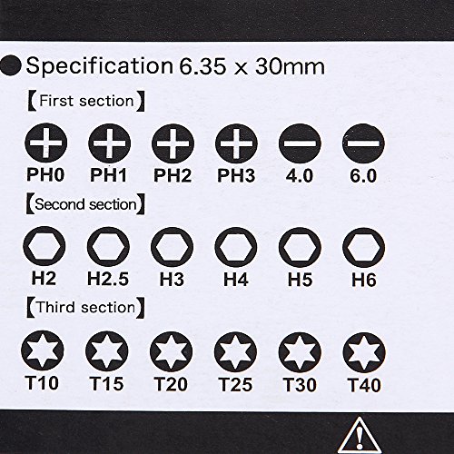 18 different magnetic screwdriver bits with a roller lock---Phillips: PH0, PH1, PH2, PH3;Slotted:4.0,6.0;Hexagon:H2,H2.5,H3,H4,H5,H6;Torx :T10, T15, T20, T25, T30, T40.