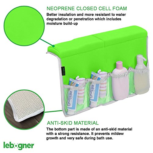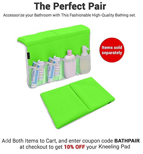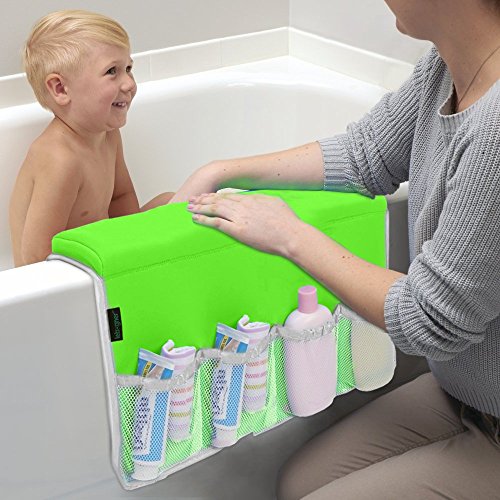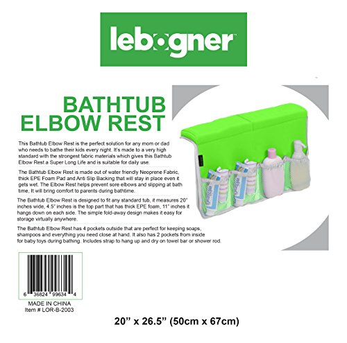 • ? The Bathtub Elbow Rest has 4 pockets outside that are perfect for keeping soaps, shampoos and everything you need close at hand. It also has 2 pockets from inside for baby toys during bathing. Includes strap to hang up and dry on towel bar or shower rod.
