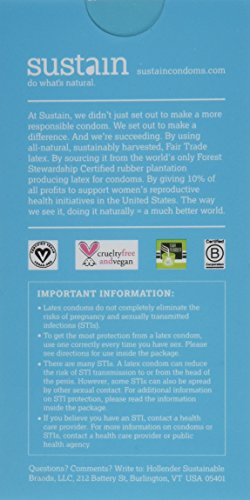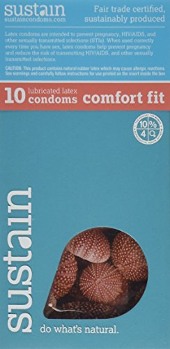 Sustain Lubricated Comfort Fit Condoms - 10 per pack -- 1 each. The Sustain Comfort Fit condom has a tapered base for a secure fit and is wider towards the tip, allowing for greater freedom of movement as you do what comes naturally (think, baseball bat). Enjoy Safe and secure - individually electronically tested, FDA approved Better for you and your partner - low odor and free of nitrosamines Better for everyone - fair trade, vegan, non-GMO, sustainable 10%4Women - 10 Percent of profits are donated to women's health initiatives Private and convenient - discreet packaging and free shipping Vegan, Dairy FreeFeature