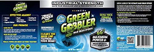 A true breakthrough in drain opening technology. This fast acting Ultimate Main Drain Opener product offers superior performance over traditional drain openers, and is biodegradable and non irritating to skin. It's high density, thickened formula is heavier then water, so it sinks and clings to the blockage and begins working quickly. Highly effective against obstructions caused by fats, oils, lint, and hair. Green Gobbler Main Drain Opener is odorless, non flammable, and safer to use then traditional drain openers. Directions: For Residential Main Line Drains: 1) Pour entire bottle into any first floor toilet. 2) Simply flush once to distribute product through pipes. Note: Best if used during low usage time, such as nighttime. Recommended to not use water for several hours after application. For Sinks & Tubs: 1) Pour 1/2 to 1 Quart slowly into drain. Allow to work for 30 minutes. 2) Flush with hot water. For extra tough clogs repeat treatment and allow to sit in drain overnight. Flush again with hot water in the morning.Feature