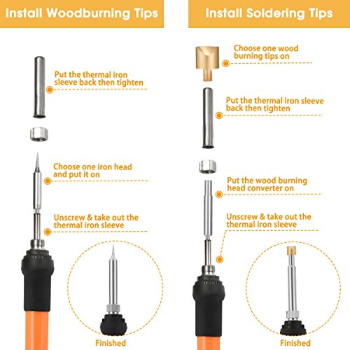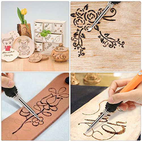 - WIDELY USED - The wood burning kit comes with 37PCS Carving/Embossing/Soldering Tips, which allows you to create a variety of designs as well as image transferring, stencil cutting, soldering, paper crafting, hot stamping and fabric embossing.it can be used easily for all skill levels including wood burning beginner, experienced and expert.