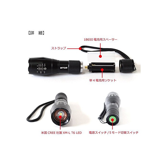 원본상품명: WTOR LED 中電 ライト ハンディライト 高輝度 ズム式5モド 2000LM CREE XM-L T6 (ブラック)