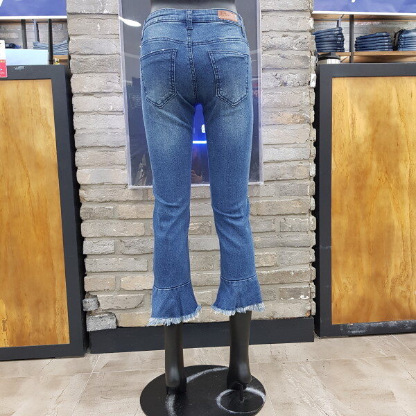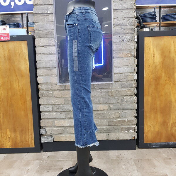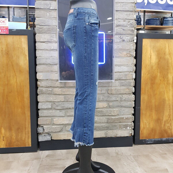 캣브러시가 들어간 미디엄 인디고 컬러의 크롭 세미 플레어 핏. 아웃심쪽에 세로로 절개가 되어있어 전체적으로 슬림해보이는 제품. 밑단의 뒷부분만 프릴장식이 있어 앞쪽에서늣 단정한 플레어 핏으로 뒤쪽에서는 경쾌한 플레어 핏으로 보이는 디자인이 독특한 아이템. ( 여성사이즈->64(25),67(26),70(27),73(28),76(29)입니다.)