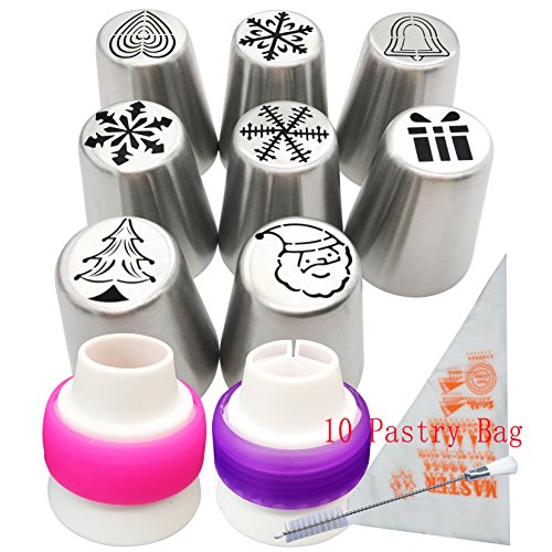 Russian Icing Piping Tips set Christmas Design for Cakes Cupcakes Cookies - 21pcs set Cake Decorating Pastry Baking Tools Kits 7pcs Icing Nozzles-2 Coupler - 10 Disposable Pastry Bags (Chirstmas Tips)
