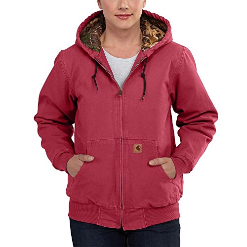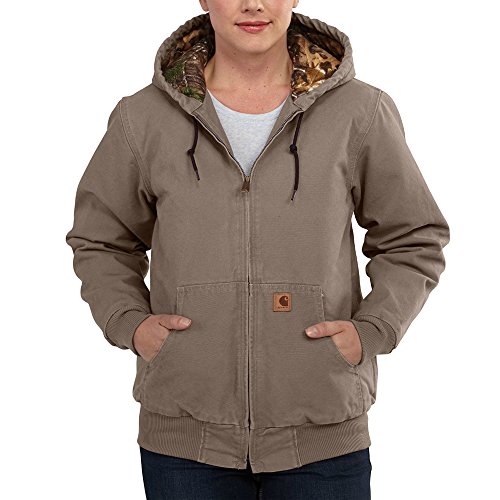 Studio : Carhartt Women's Collection Publisher : Carhartt Women's Collection Binding : Apparel Product Description The real tree camo lining in this sandstone active jacket adds interest to a tough jacket. With 12-ounce, 100 percent cotton sandstone duck and real tree camouflage pattern quilted-flannel lining in body and quilted-nylon lining in sleeves, this jacket has and attached quilted-flannel lined hood with draw cord closure, two large lower front pockets, two inside pockets, rib-knit cuffs and waistband and tripled-stitched main seams with a back length of 27 1/2 inches. 0