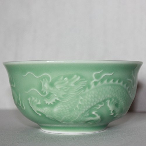 Chinese Celadon Pottery Green 4.5Inch Rice Bowl Engraved Dragon and Phoenix