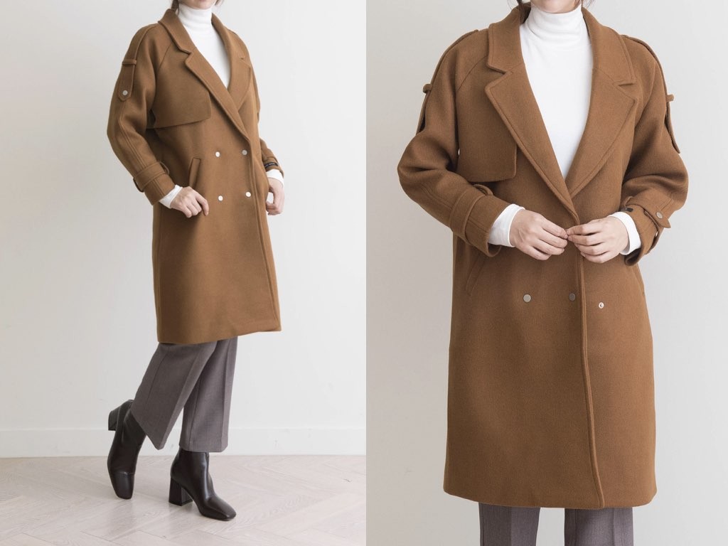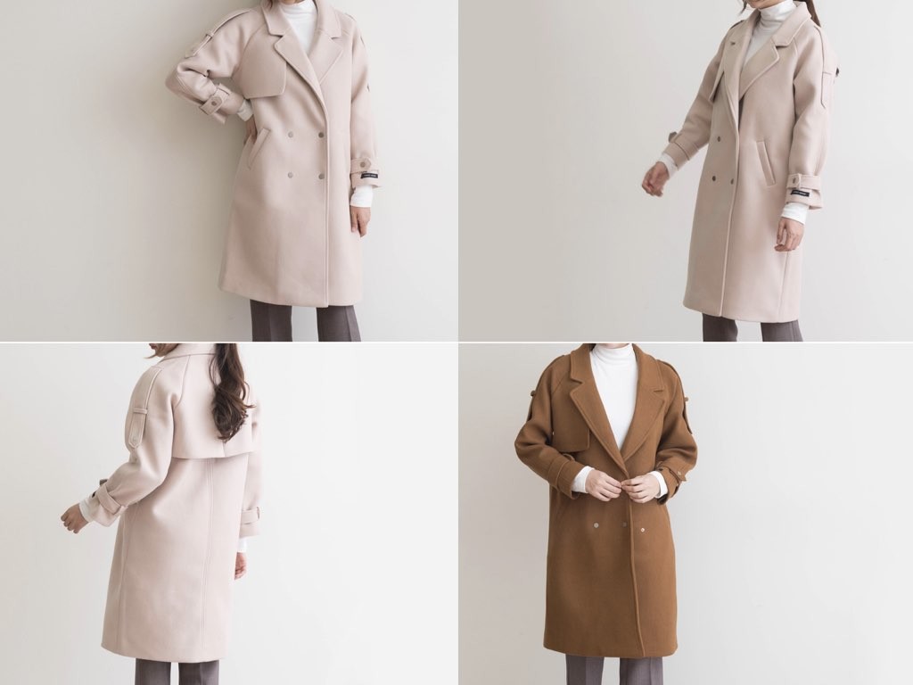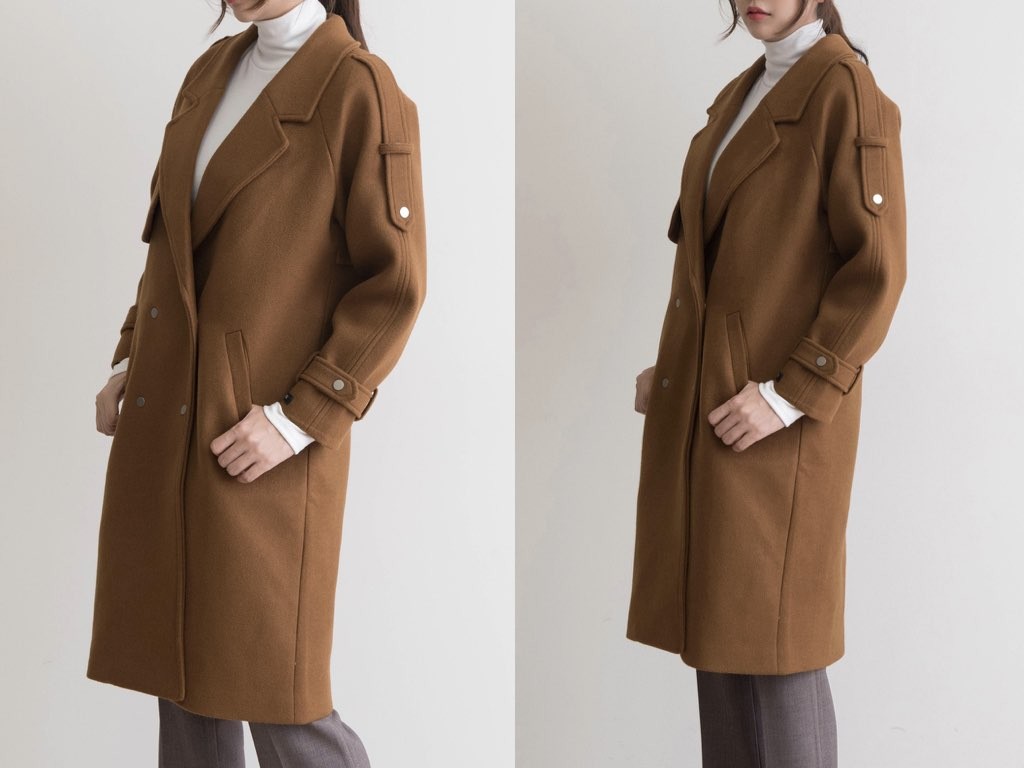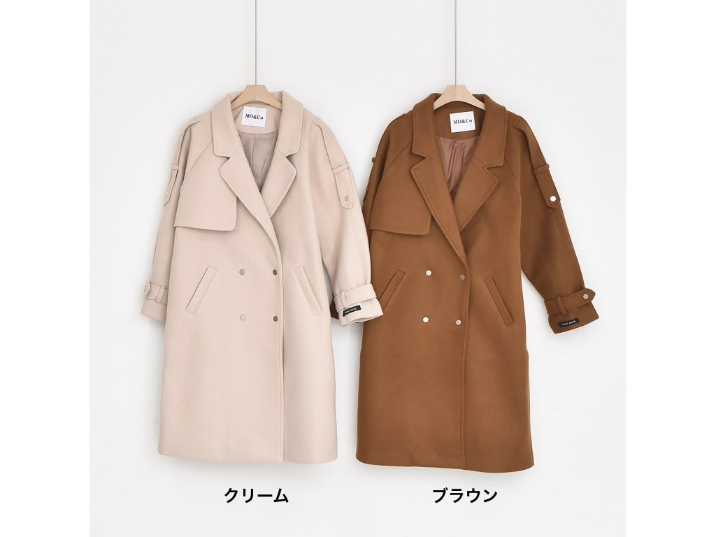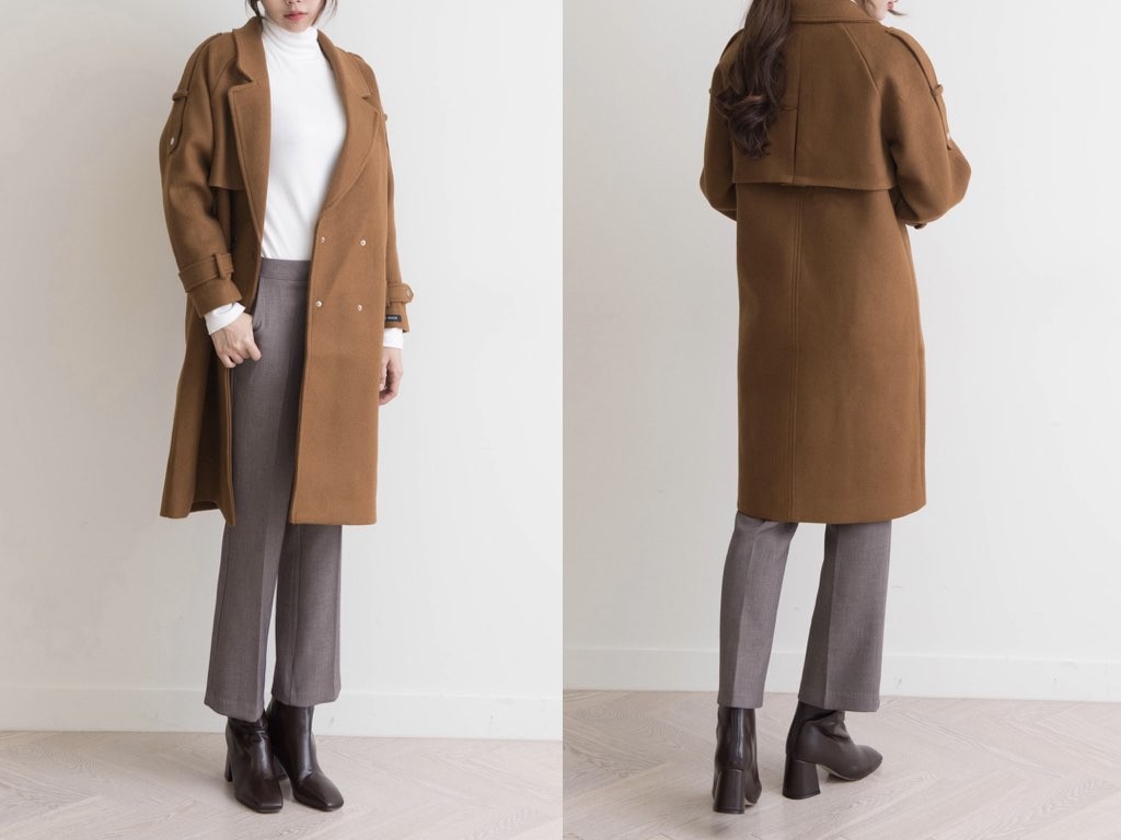 ダブルのロングコートです。さらりと着流せる長め丈です。これ一枚で旬な着こなしが実現しますね。きれいめスタイル、通勤スタイルにも、とてもマッチしますね。商品は、とても丁寧なつくりとなっています。1.基本情報色:2色展開(クリーム/ブラウン)サイズ:Free素材:ウール混製造国:Korea2.サイズ情報肩幅:57cm身幅(胸断面):55cm 腕の長さ:48cm 着丈(前):105cm (サイズは計る方法に応じて±2〜3cmの誤差があります。ご了承お願い致します)モデル着用サイズ:F※着用モデル(163cm、体重47kg、足のサイズ24.5cm)3.その他の情報厚み:中間透け感:なし伸縮性:なし裏地:あり洗濯方法:ドライ(クリーニング)[注意事項]お取り寄せ商品は、海外より仕入れるため納品まで約10日前後いただきます。また店舗でも販売しており、在庫切れになる場合もございます。ご了承お願い致します。