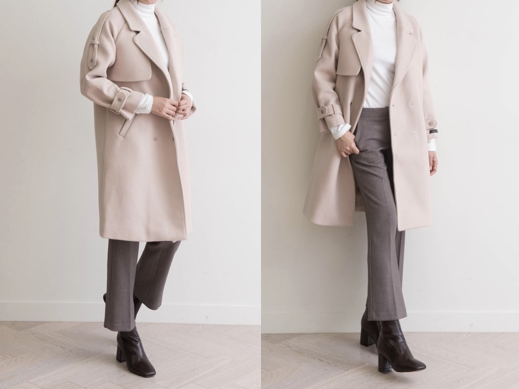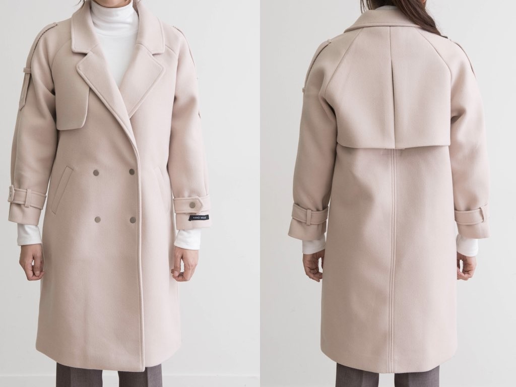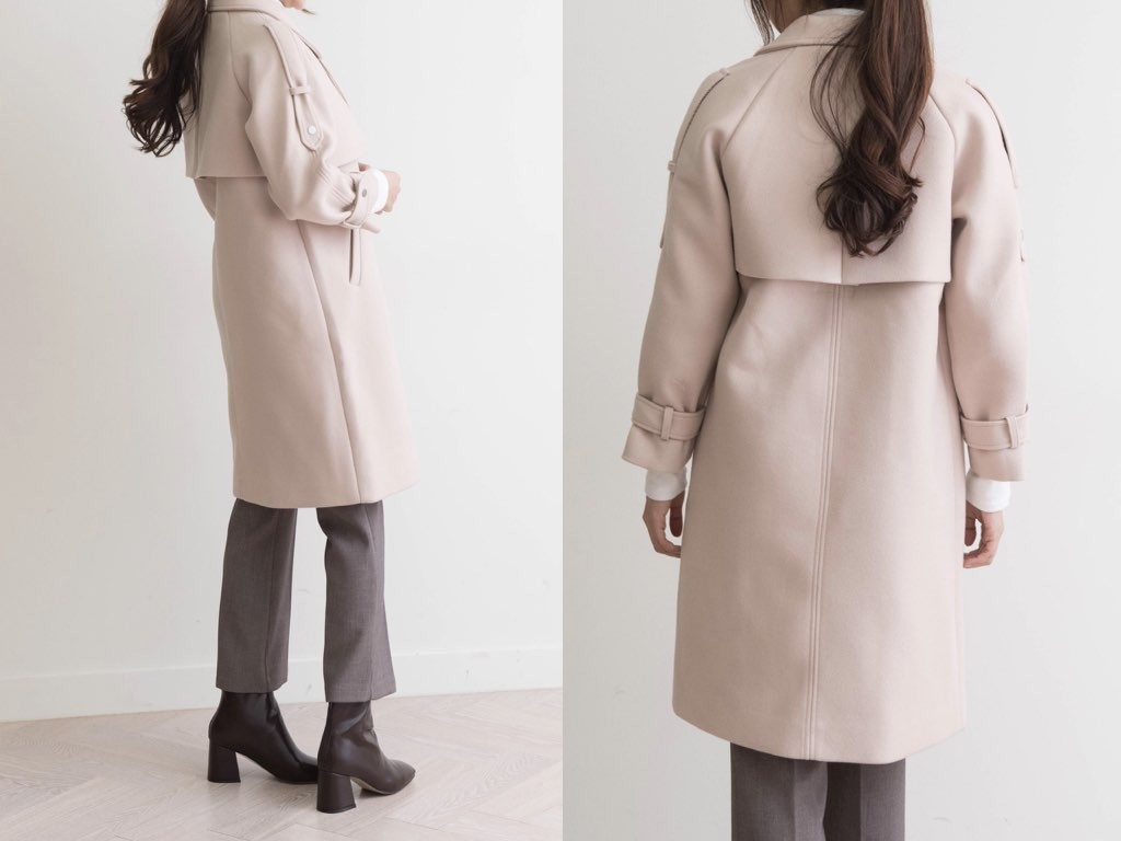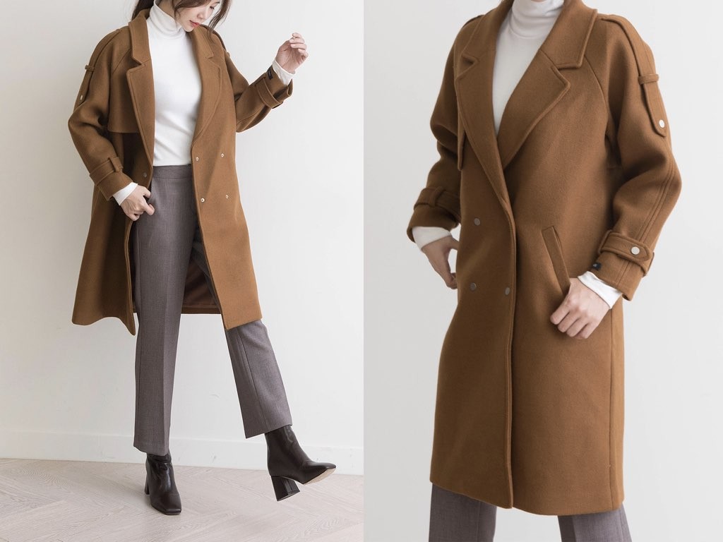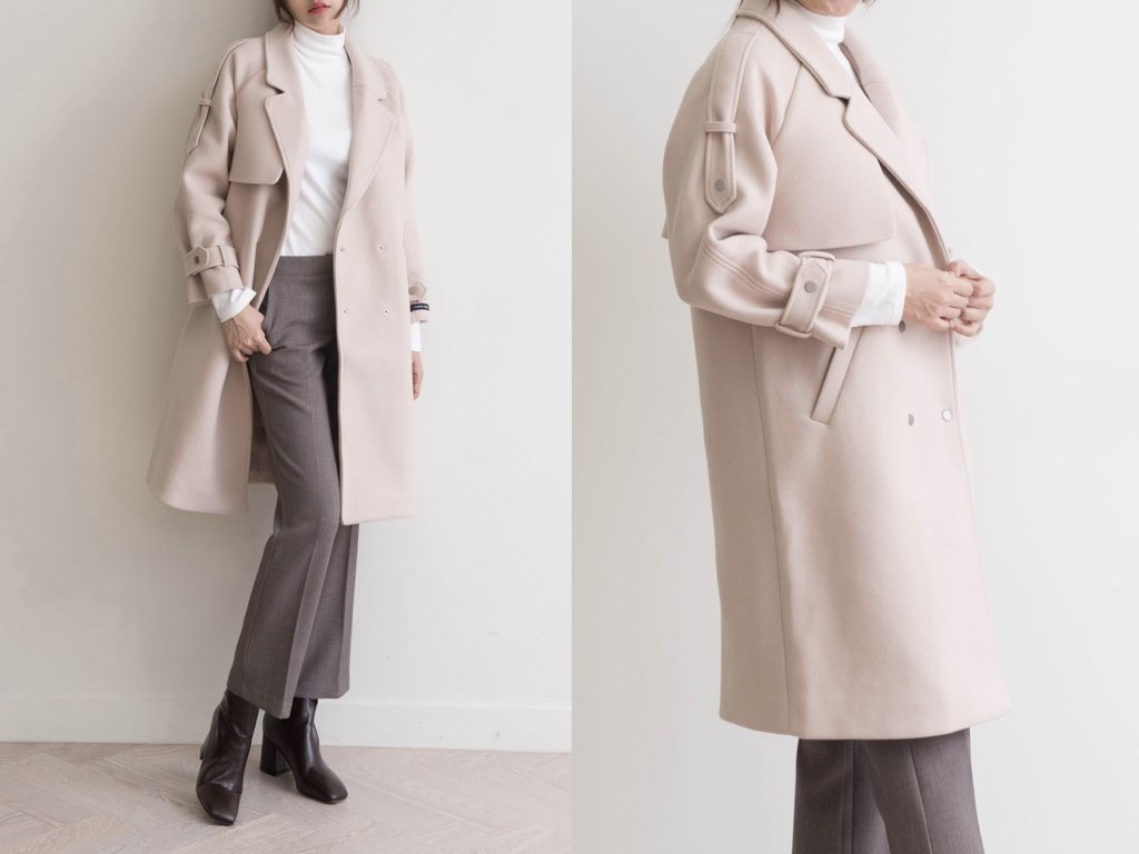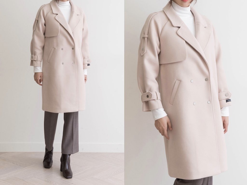 ダブルのロングコートです。さらりと着流せる長め丈です。これ一枚で旬な着こなしが実現しますね。きれいめスタイル、通勤スタイルにも、とてもマッチしますね。商品は、とても丁寧なつくりとなっています。1.基本情報色:2色展開(クリーム/ブラウン)サイズ:Free素材:ウール混製造国:Korea2.サイズ情報肩幅:57cm身幅(胸断面):55cm 腕の長さ:48cm 着丈(前):105cm (サイズは計る方法に応じて±2〜3cmの誤差があります。ご了承お願い致します)モデル着用サイズ:F※着用モデル(163cm、体重47kg、足のサイズ24.5cm)3.その他の情報厚み:中間透け感:なし伸縮性:なし裏地:あり洗濯方法:ドライ(クリーニング)[注意事項]お取り寄せ商品は、海外より仕入れるため納品まで約10日前後いただきます。また店舗でも販売しており、在庫切れになる場合もございます。ご了承お願い致します。